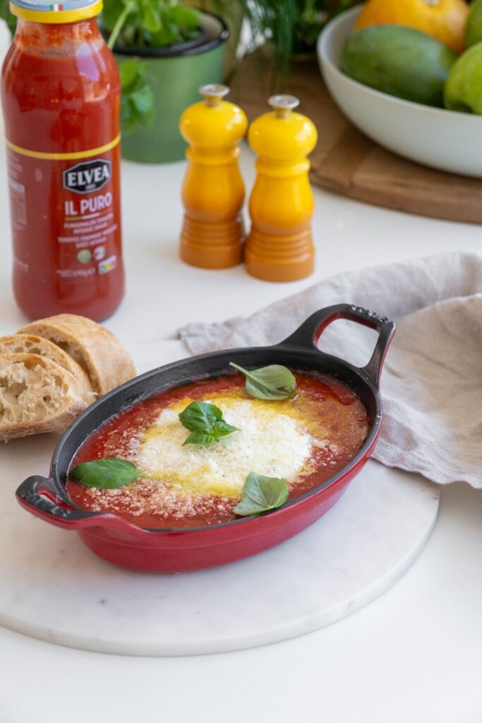 Neem een ovenschaaltje en giet er de fijngemalen tomaten in. Plaats de bol burrata in het midden. Besprenkel met olijfolie en kruid met peper en zout. Zet in de oven voor 8 à 10 minuten, tot de kaas gesmolten is en de saus pruttelt.